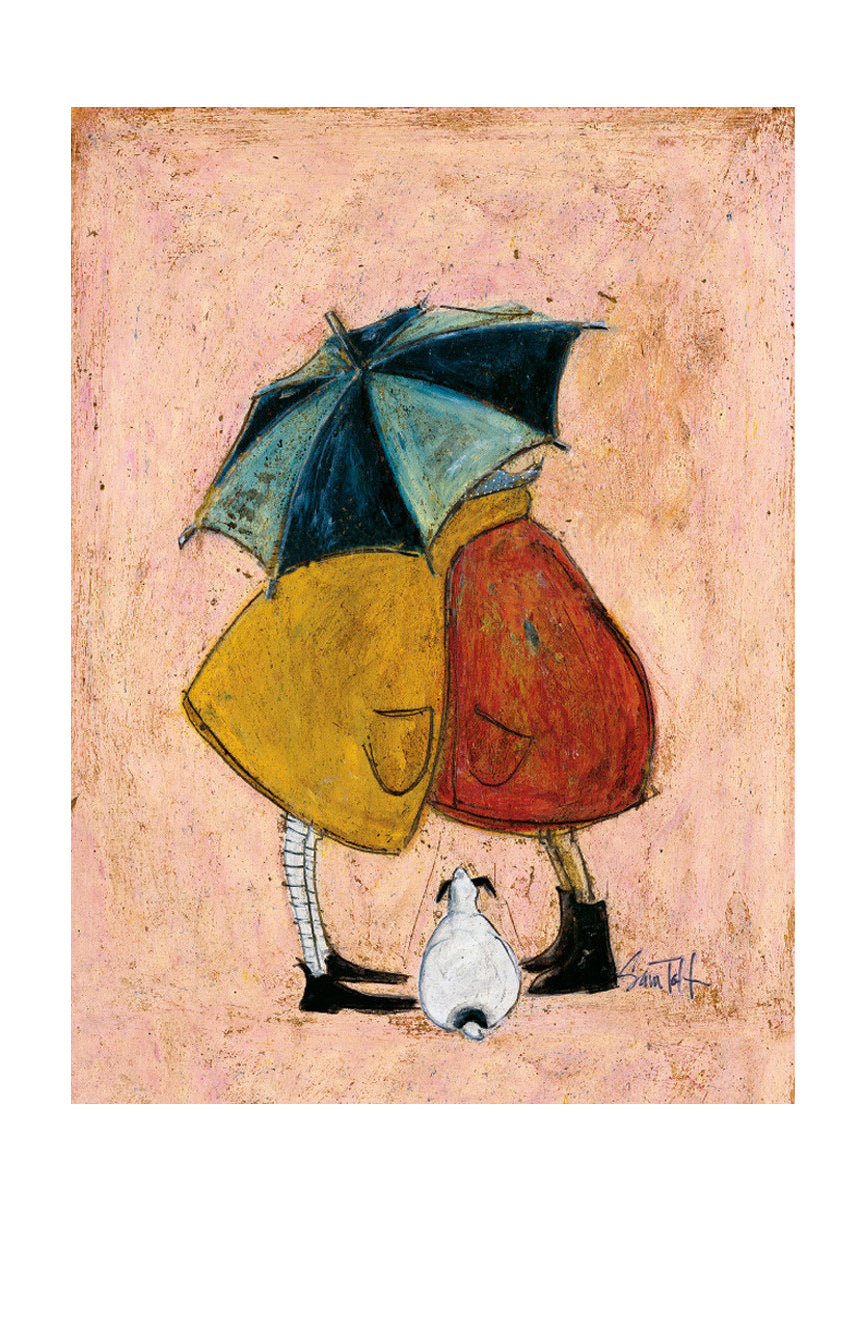 Art Print: Sam Toft is an artist best known for her whimsical work featuring a collection of characters called 'The Mustards'. This charming print will inspire romance and happiness in your home with its delicate illustrative lines and cheeky title. 'A Sneaky One' features Ernest and Violet in big jackets as they snuggle together under a blue umbrella and share a sneaky kiss in the rain, meanwhile their little white dog, Doris, looks up to see what's going on. This is a truly enchanting piece with a great sense of fun which will radiate throughout your home whatever the weather outside.