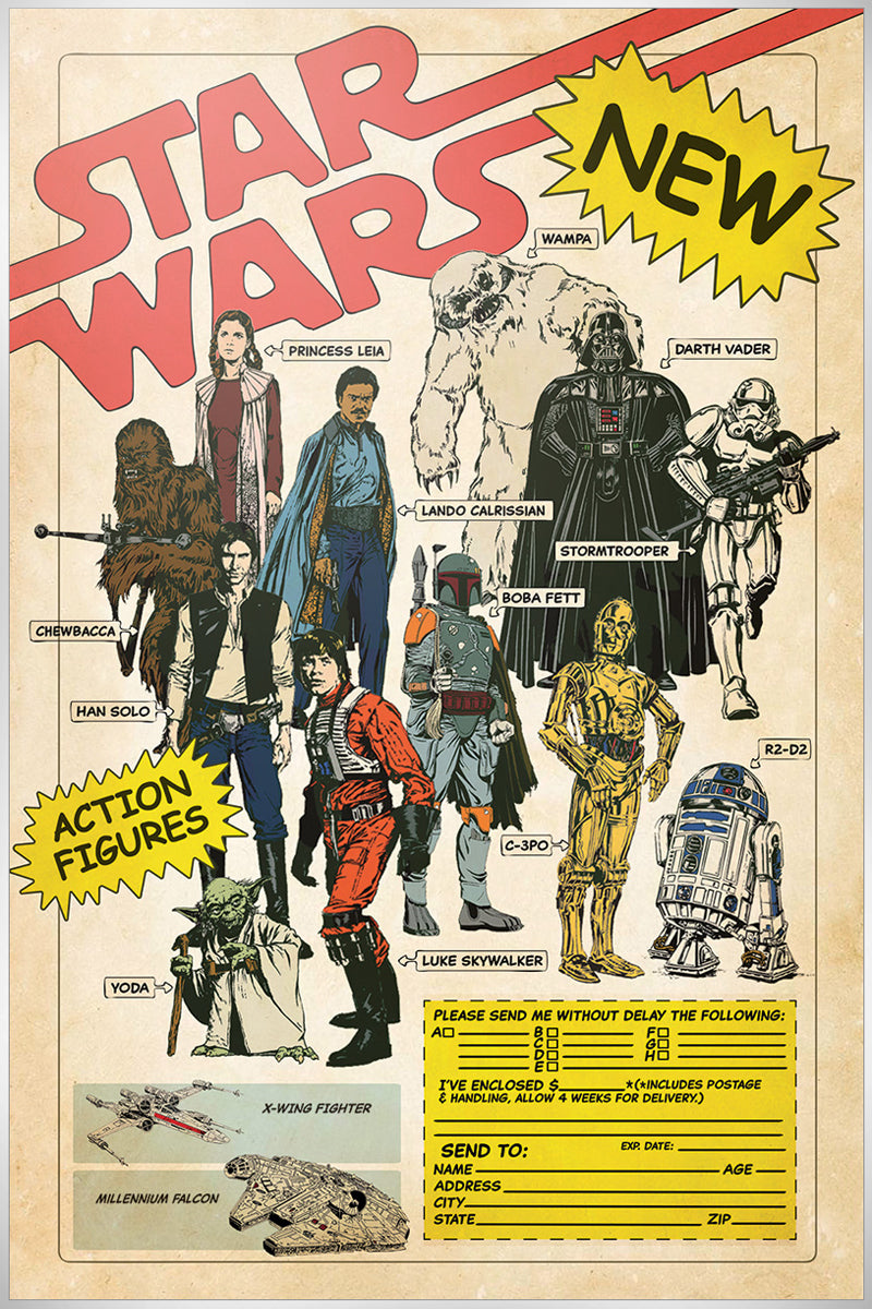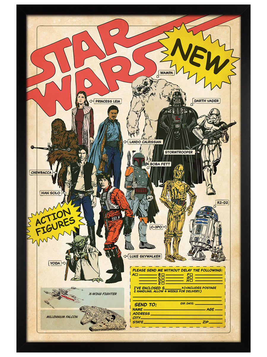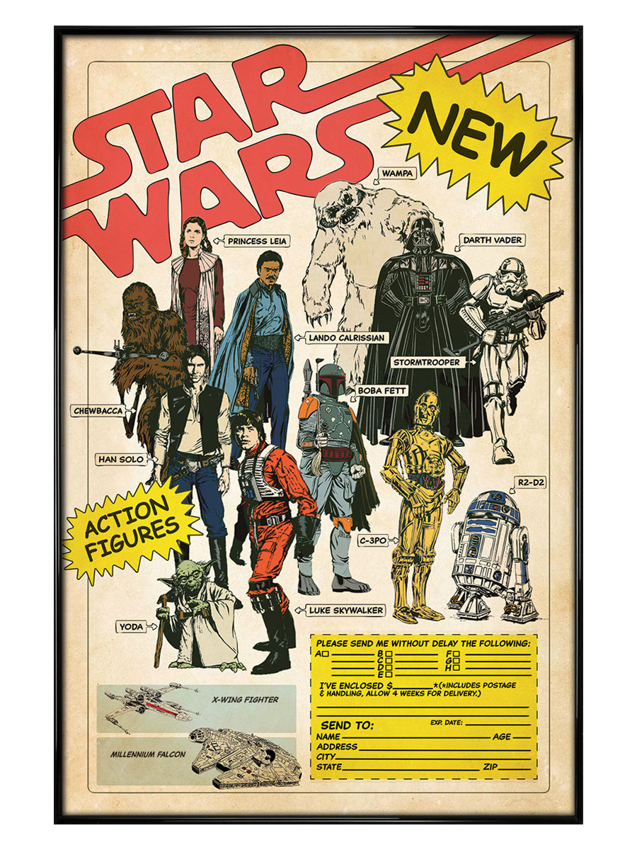 Recapture the nostalgia of Star Wars with this iconic poster featuring a host of your favourite characters from the sci-fi story. Originally seen within the pages of a comic book, this classic action figures design would have also served as your way to order your favourite action figures. Whether you were looking to complete your collection or start it, you could pick and choose which character you wanted to add to your collection. Whether you needed Luke Skywalker, Darth Vadar, R2D2 or Han Solo, you could eventually collect them all. For all fans of the classic sc-fi movie, this is a must have poster to add to your collection.