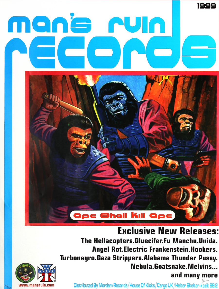 Limited Edition Art Print: Frank Kozik's style of advertising took the music scene by storm in the 1990's. His bold and eye catching graphic designs demand the onlooker's attention and with incredible imagination he created a huge collection of different posters which advertised some of the best bands of the time. This one, "Ape Shall Kill Ape" features a band line up for the SXSW Festival which happened on March 20th 1999 and included Alabama Thunder Pussy, Fu Manchu and Gaza Strippers to name a few. So if you want to get your hands on this incredible limited edition, signed print of the original poster then you'd better hurry!