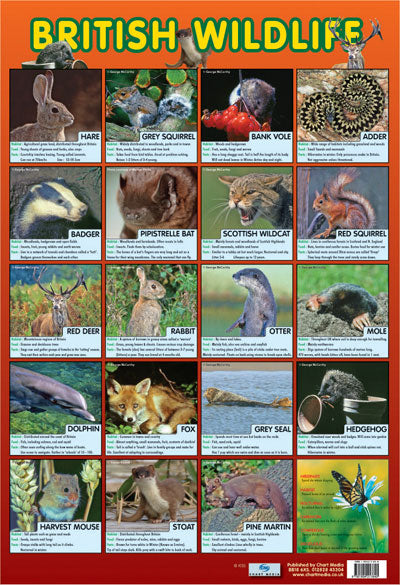 Educational Mini Poster: This beautifully photographed glossy poster shows 19 different native animals of The British Isles. Underneath each photo are details about the habitat, food and a couple of facts about the animal concerned such as the red squirrel's nest is called a drey and an otter's resting place is named a bolt. Featuring animals as diverse as a pine marten, adder and a hedgehog this fascinating little poster is sure to draw attention wherever it is placed.