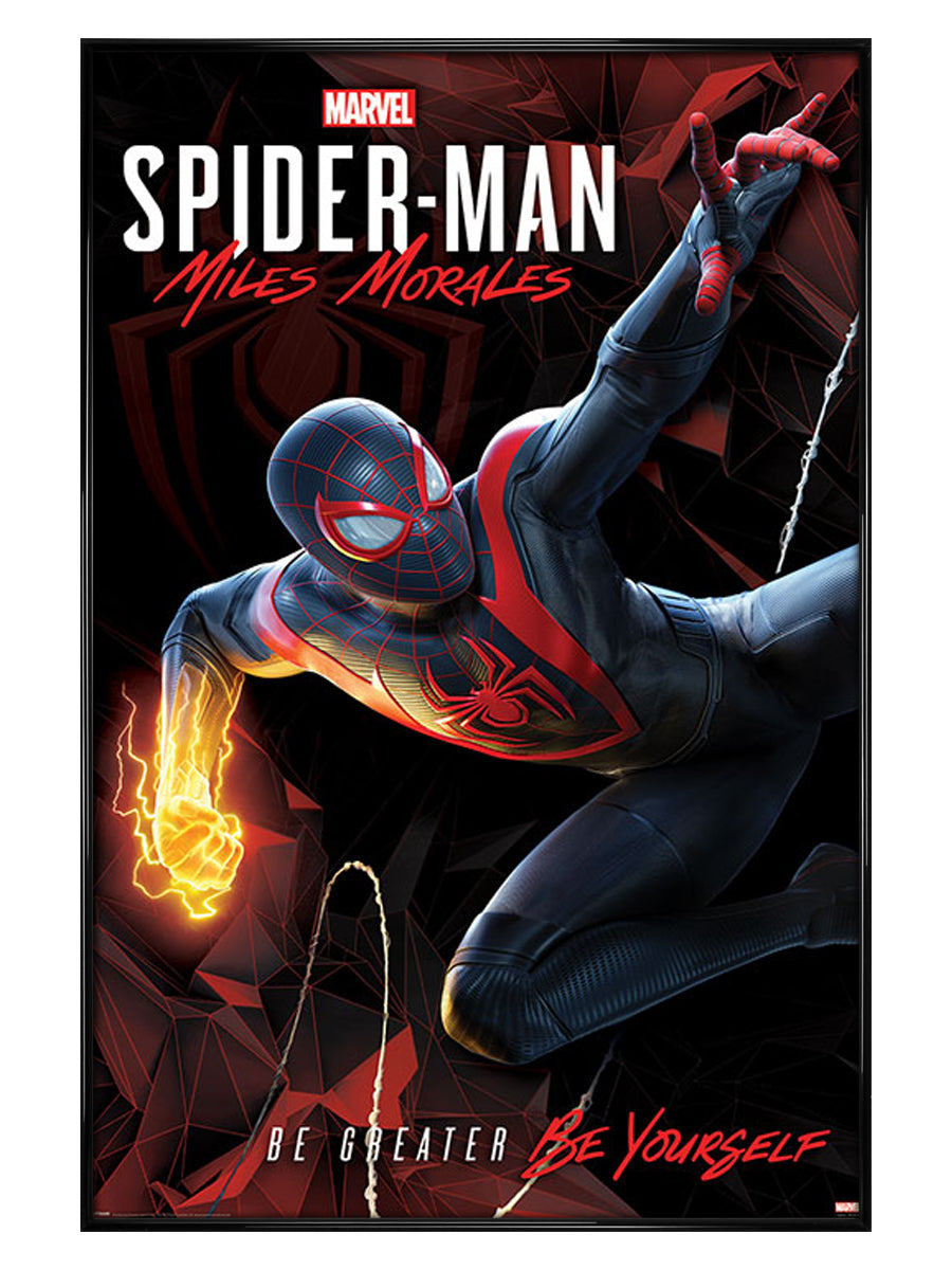 Developed by Insomniac Games, Marvel's Spider-Man: Miles Morales was released to popular acclaim at the end of 2020. This magnificent maxi poster sees the world-famous superhero showing off his powers as he swings through the air. Complete with the inspirational motto 'Be Greater, Be Yourself'.