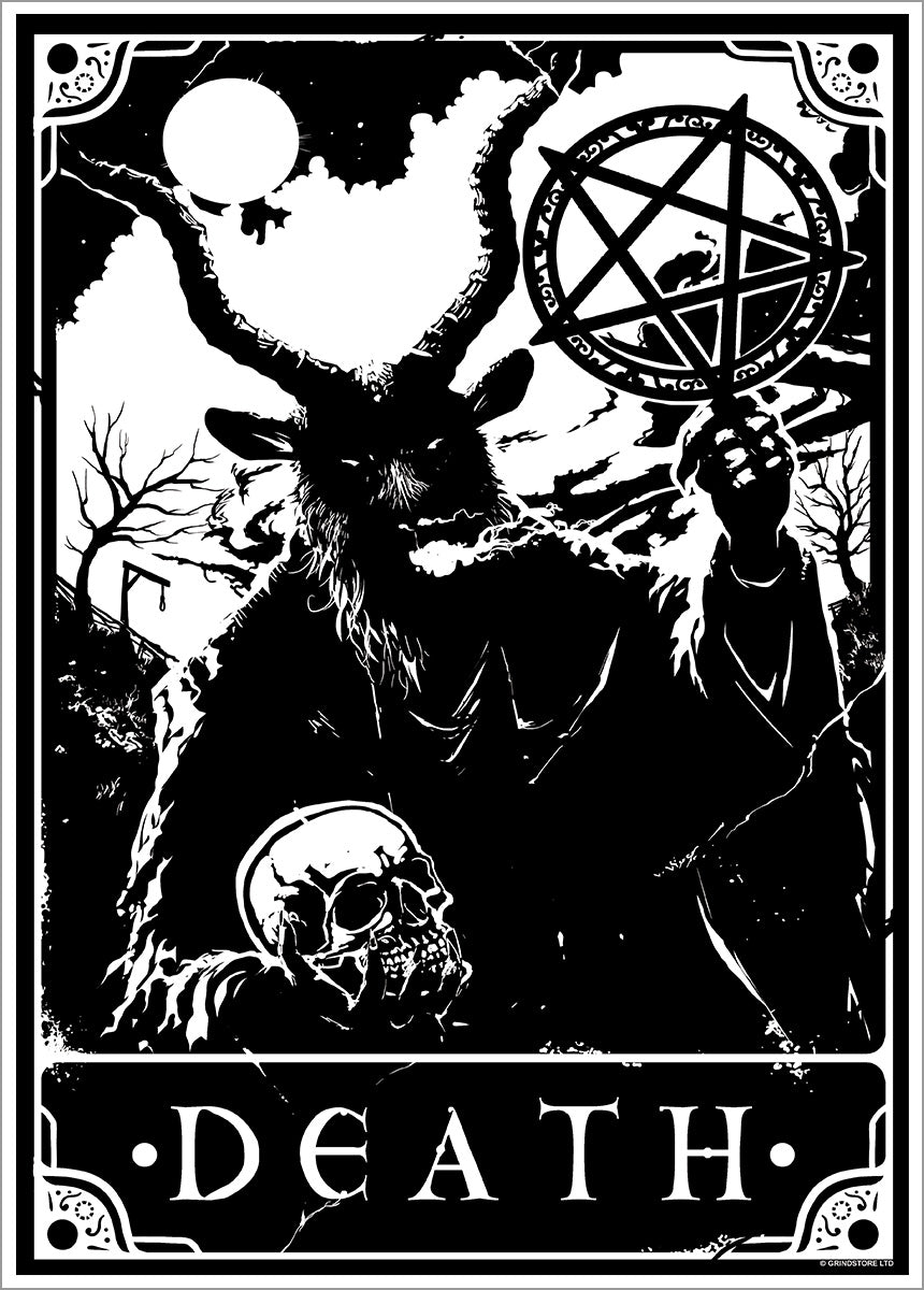 Roaming the land of destruction littered with symbols of the devil, this worker of the devil is after his next victim. Holding a large pentagram in one hand and the skull of his last defeat in the other, this horned beast is not to be approached unless you have a death wish. Using influence from decorative tarot cards, this card symbolises the end of something in your life. If you have a curiosity about tarot and a gothic sense of style, we're sure this mini poster is meant to be yours.