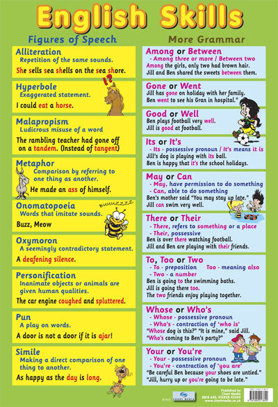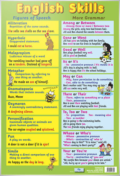 English Skills Mini Poster: This glossy, educational poster is the perfect start for children who are venturing into more advanced English. Bursting with information on figures of speech and grammar, your child will soon be up there with Shakespeare and Samuel Beckett. The first section of the poster contains nine figures of speech and their explanations including alliterations, malapropisms, oxymorons and similes as well as many more. The second section of the poster focuses on grammar such as when to use words like there and their and may or can. Each has an example to make the words and meanings easily understandable and there are colourful illustrations included to help with association. A great mini poster for children at home or at school who are looking to make the next step into the English language.