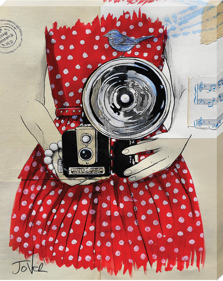 Smile for the camera! This beautiful design comes from the talented hands of Australian born artist, Louis Jover, and is a perfect example of his ever growing collection of works! Featuring a lady in a red, polka dot dress, holding a hefty retro camera, this unique canvas print is the perfect gift for any budding artist or photographer. So pick up your camera and be inspired to create your own visual stories!