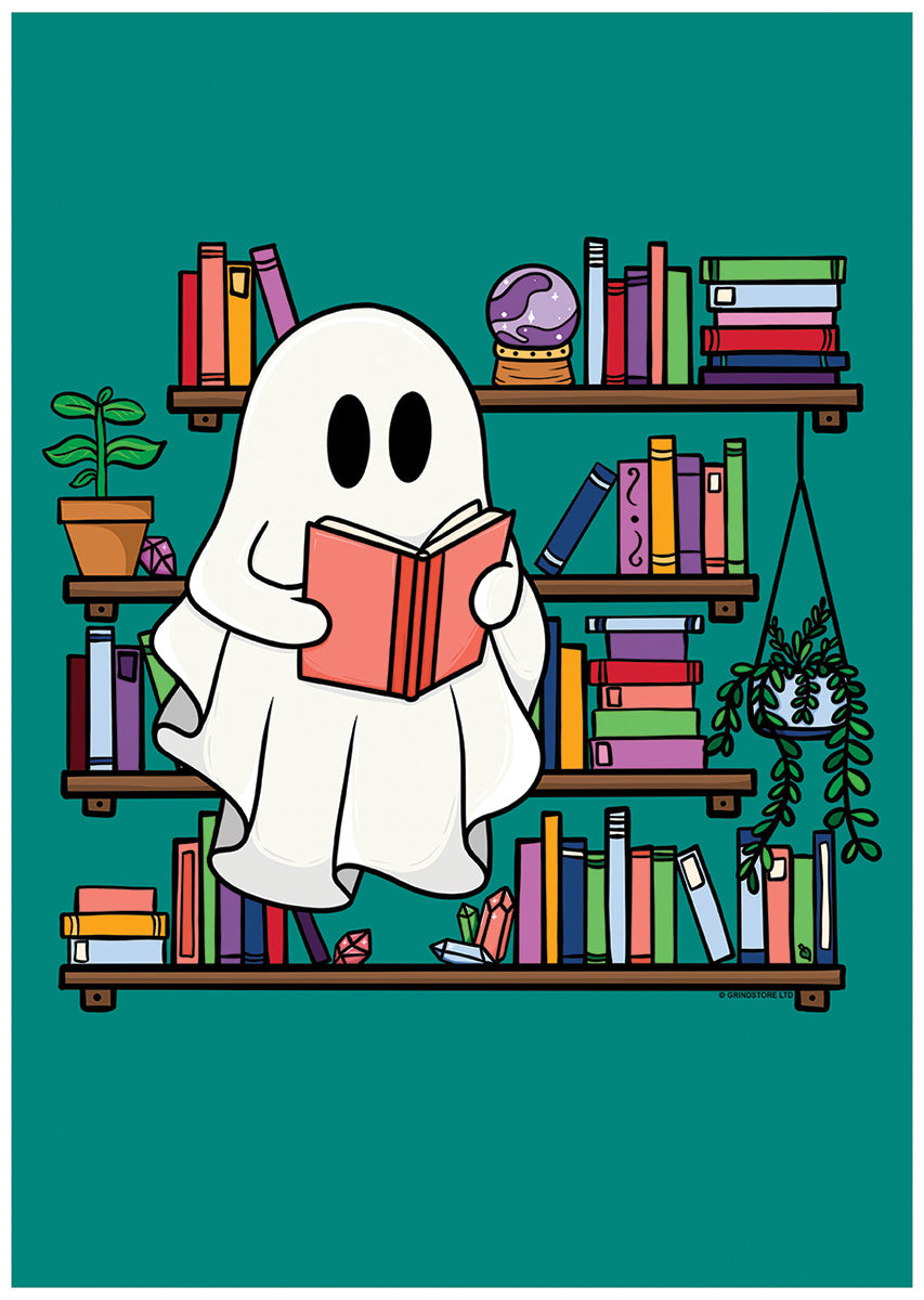 Add a pop of colour to brighten up your walls with this Galaxy Ghouls mini poster. Featuring a cute ghost reading a book in front of a bookshelf with an array of different coloured novels, this is the perfect addition for any spooky loving bookworm.