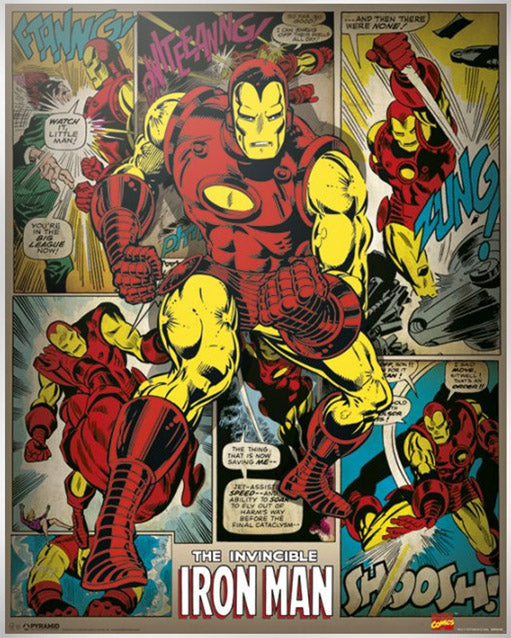 Children's Mini Poster: Business tycoon Tony Stark dons his iconic Iron Man suit as he prepares to take down the evil of the world on this awesome Marvel comic mini poster. Storming through the debris, the red and yellow suit glints in the sunlight as the invincible Iron Man comes to the rescue. If you are a fan of the iconic super hero then why not hang this action packed poster on your wall and bring back that classic comic strip action and adventure.