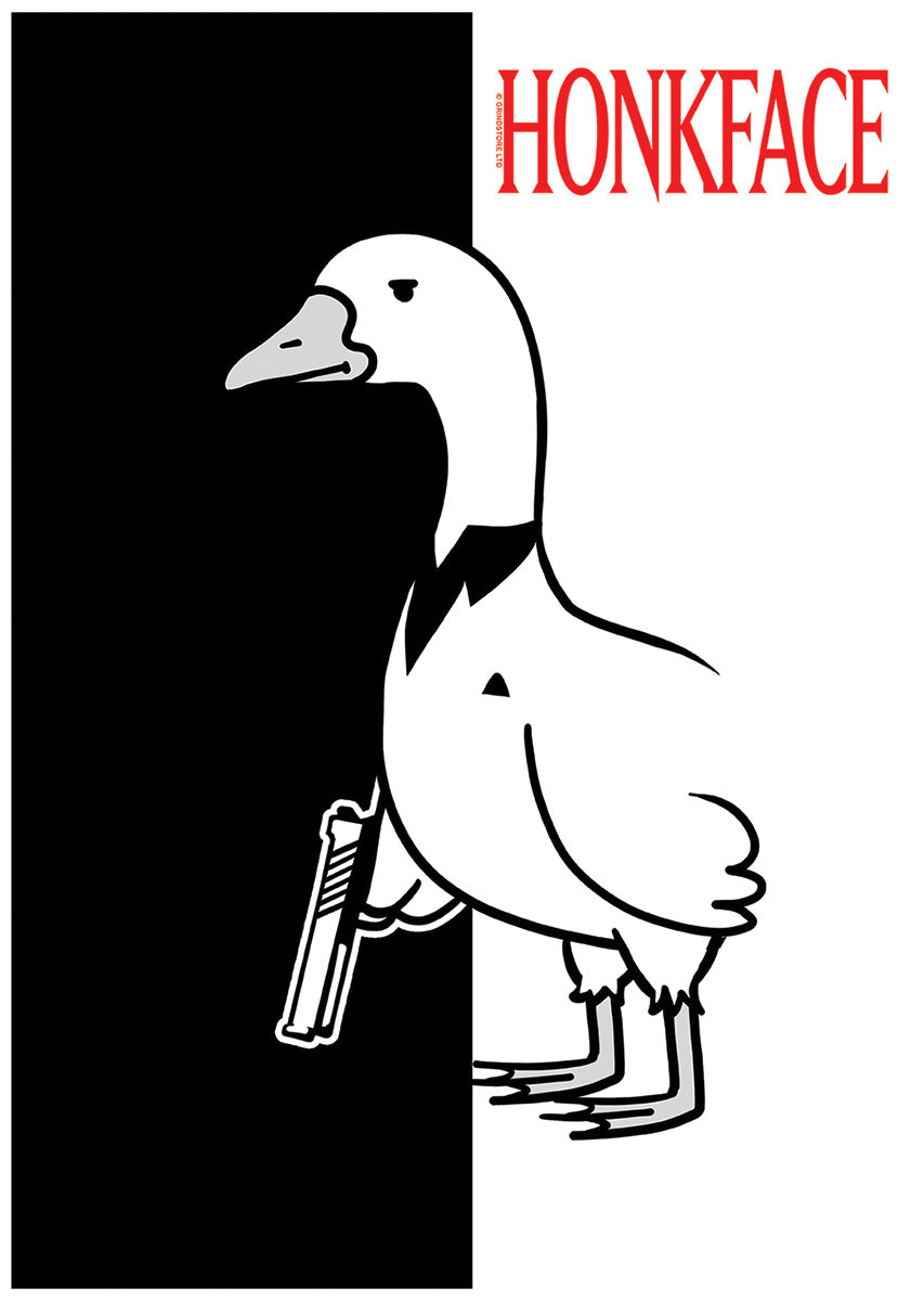 Say hello to your little honk with this Silly Goose Honkface mini poster—a hilarious parody bursting with attitude. Featuring a gritty, high-contrast design of a goose striking a power pose in a dramatic black-and-white layout with bold red text, it channels pure chaotic energy. This mini poster blends crime-lord swagger with barnyard absurdity for a look that’s both ridiculous and iconic. Perfect for fans of parody art, unhinged humour, and fowl play at its finest.