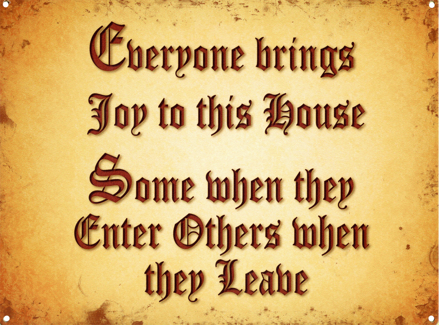 Humour Tin Sign: Make you home even more welcoming with this wonderful tin sign in the style of classic calligraphy. The background in a worn sandy colour which create the feeling of a lived in environment and it creates the perfect setting for the arguably heart warming quote "Everyone brings joy to this house. Some when they enter, others when they leave". Radiating a light hearted welcome into your home, this comical tin sign is a must have for anyone who wants to get some giggles from friends and family.