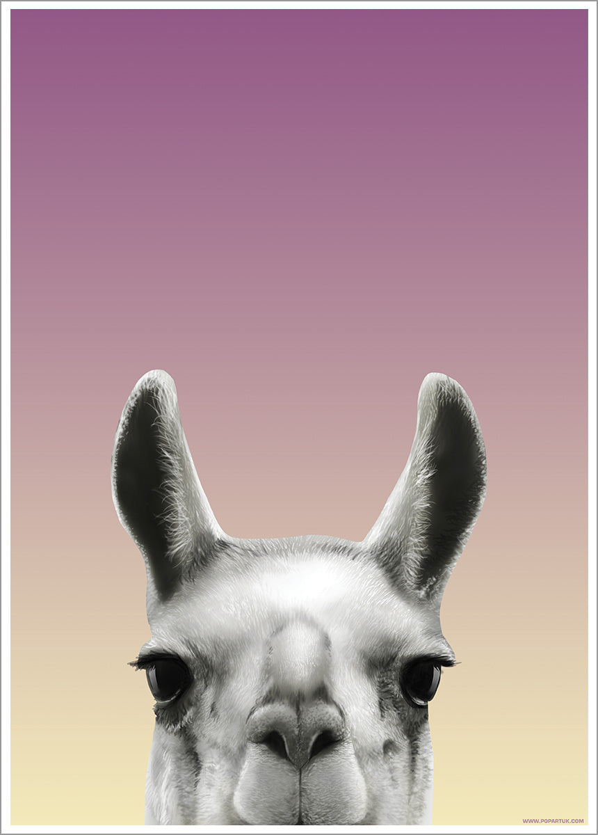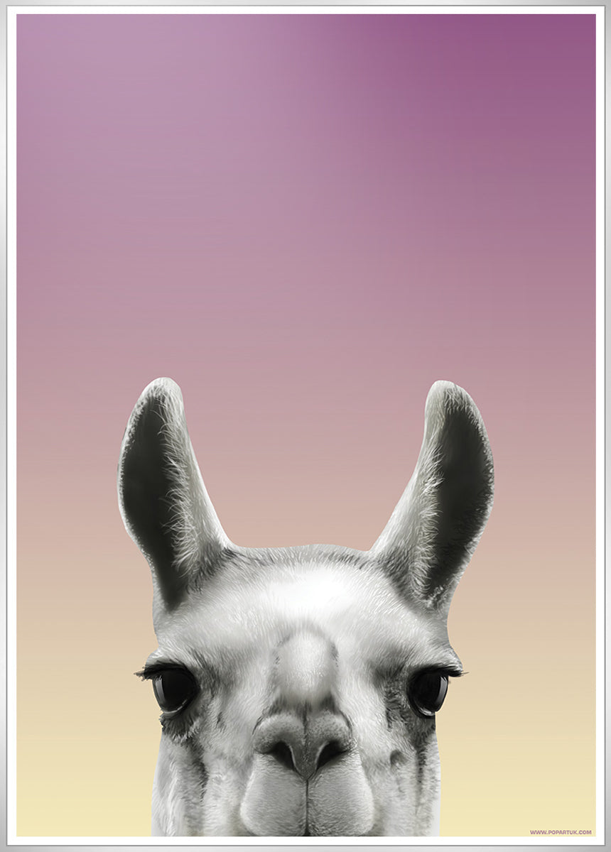 Rearing its head in wonder, this cheeky Llama questions its surroundings. Eyeing the environment as he ponders his next move, this long eared chap plucks up the courage to peek its head just high enough that it can see everything that's going on, without giving away its position. For anyone obsessed with Llamas, this bold print from Inquisitive Creatures is a great way to decorate your wildlife loving home.