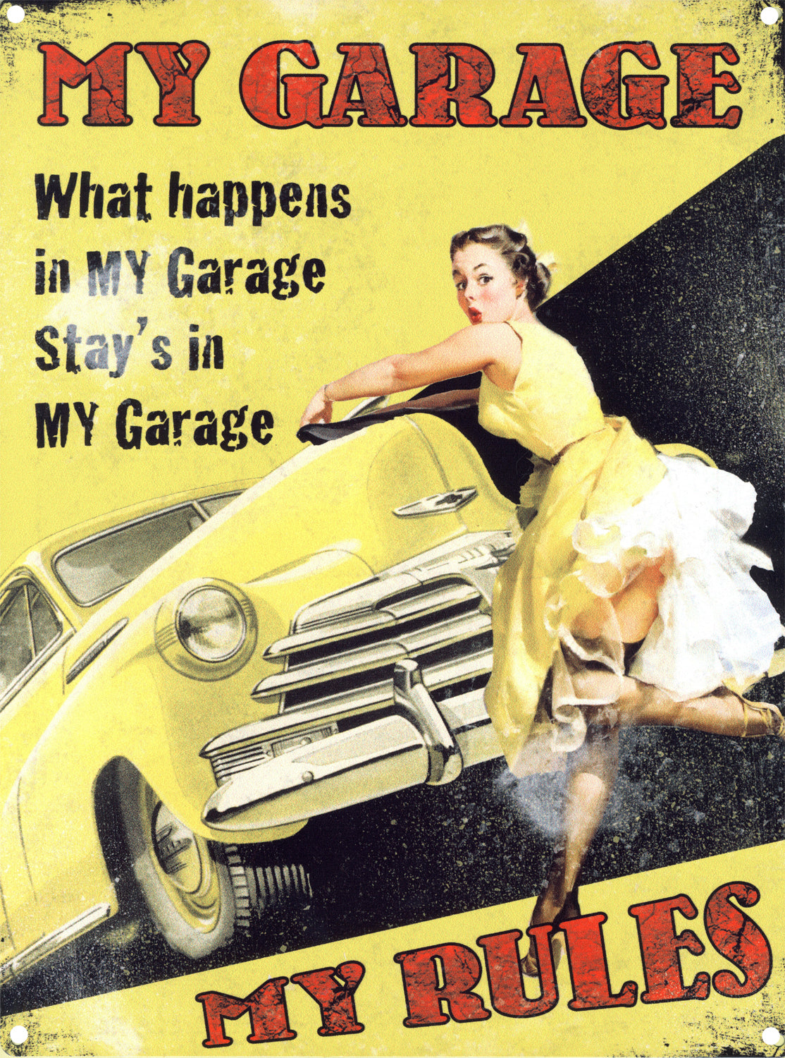 Humour Tin Sign: Put pay to the stereotypes that only men can have their garages with this comical, retro style tin sign. Showing off her yellow dress and stockings underneath, this one woman workshop states "My garage, my rules". Perfect for women who enjoy taking care of their cars or even just posing on the bonnet in a cheeky display of femininity, this tantalising retro tin sign is guaranteed to brighten up any bedroom or workshop wall.