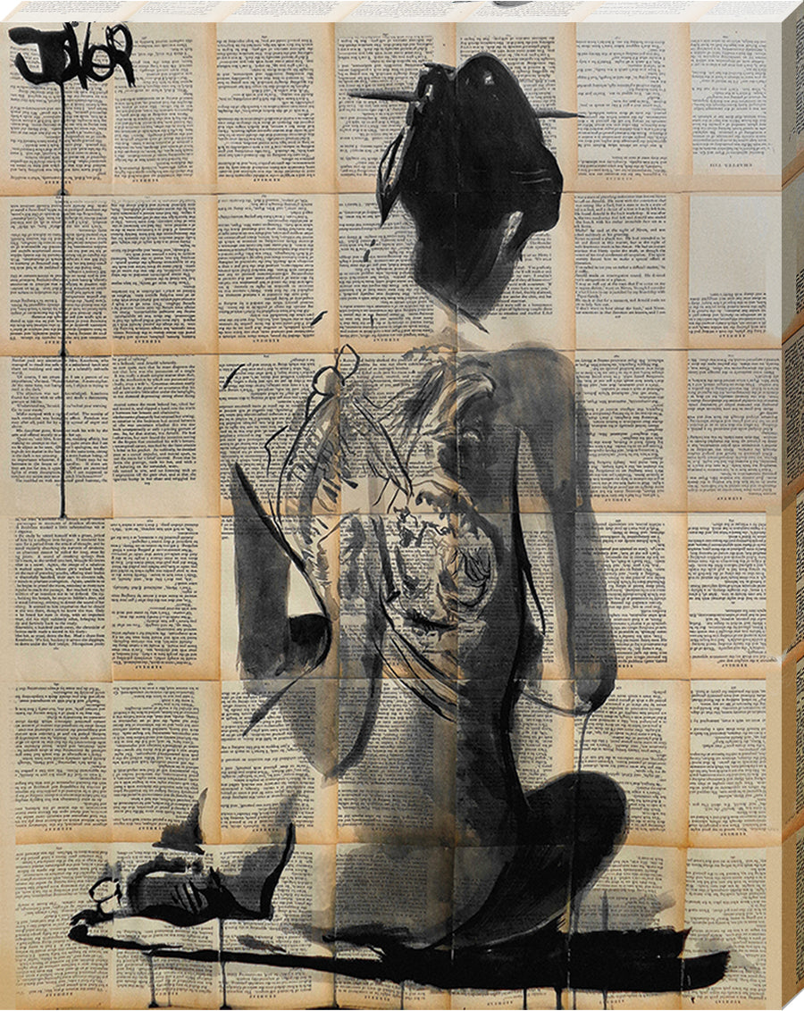 A beautiful balance of feminine elegance meets abstract contemporary, this canvas print from Australian artist Loui Jover features a nude female figure resting, her back to us showing her Oriental themed body art. Completing her effortless beauty is a 'fa-zan' - a Chinese hairpin. Jover's iconic art style using mixed mediums - vintage book papers and ink wash paint - make this statement print a timeless piece.