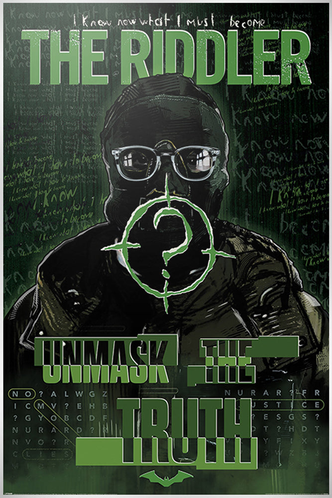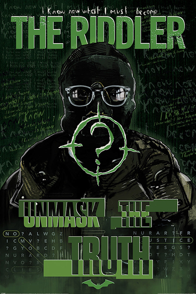 The Riddler is stalking Gotham City and only The Batman can stop him. The world's greatest detective must team up with Lieutenant James Gordon to bring the Riddler to justice but will they do so in time? This cool maxi poster looks at the latest member of the Dark Knights rogues gallery to be brought to the big screen again.