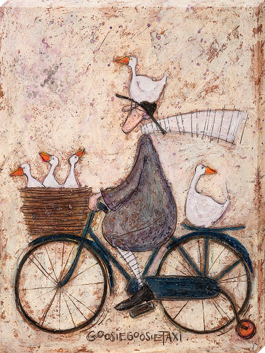 This amazing canvas print is created by lovable English artist Sam Toft, who imagined her characters while dawdling along the seafront. As Mr Mustard leisurely glides along on his bicycle it appears he's picked up some feathered friends for a taxi ride. With three happily in his basket, one precariously on the back and one perched happy on his hat, it looks like Ernest is enjoying a game of goose, quite literally! Sealed with the caption 'Goosie goosie taxi' at the bottom, it looks like Ernest is in for one 'peck' of a ride. This beautiful canvas print is sure to look amazing in anyone's home.