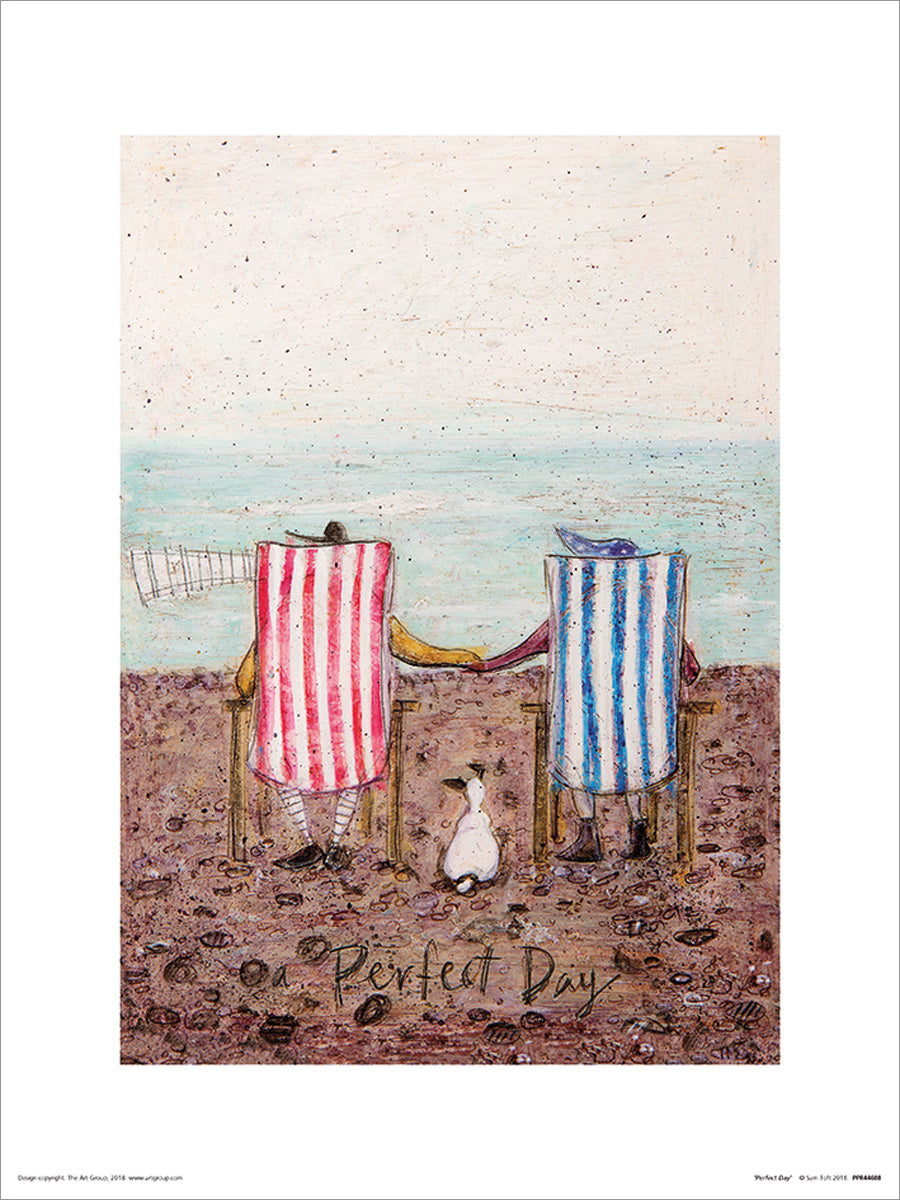 Hand in hand, with their matching deck chairs and of course little Doris sandwiched between them, Mr and Mrs Mustard find themselves thinking, what could be better than this? With the simple things in life turning out to be the most important, spending time with your loved ones in your favourite place is surly the 'Perfect Day'! Capturing the love and sand-whipping winds of the British coast, Sam Toft's print is just ideal for your cosy home, for you and your family to enjoy.