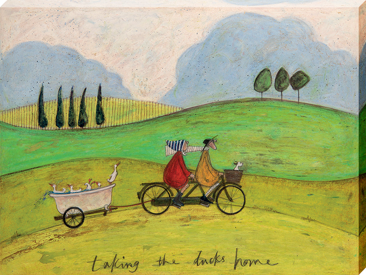 Popped in a lovely warm bath and attached to Mr and Mrs Mustards tandem bicycle, they make their way back home to the comforts of the pond. Through the rolling hills they cycle, putting in hard work to earn themselves a hot cup of tea at the end of the day. This simple yet endearing canvas print by Sam Toft tells another tale of the Mustard family. Ducks in tow