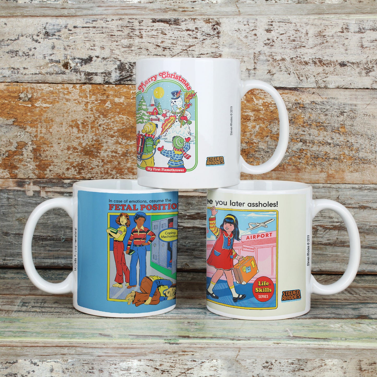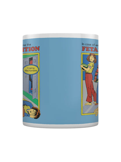 In case of emotions, assume the fetal position. This comical coffee mug from Australian illustrator Steven Rhodes pokes fun of health and safety guides with this retro design, inspired by children's books. Set in a vintage high school, a student is depicted curled up on the floor in their coping mechanism of choice.