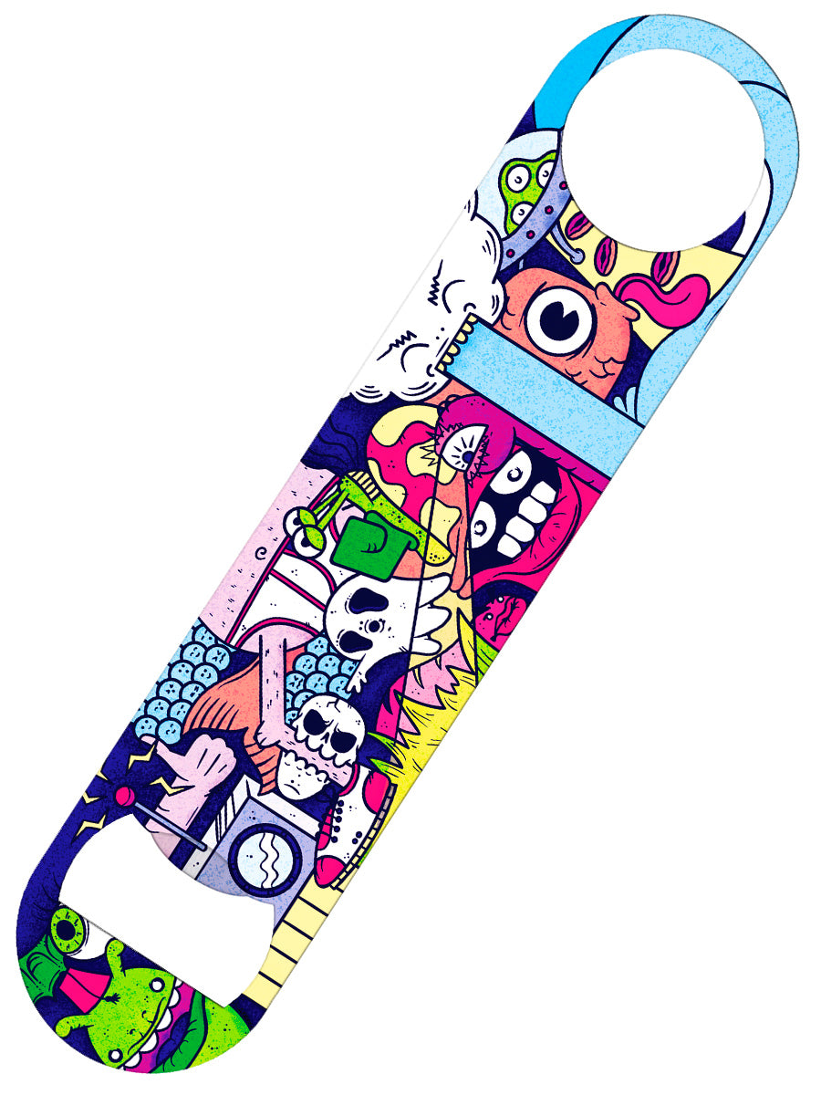 For anyone searching for a unique way to crack up their next bottle of beer, this brightly coloured bar blade/bottle opener is the perfect solution. Featuring a mesmerizing 'Technicolour Nightmare' design which features aliens, ghouls, giants and spaceships. This incredibly loud and colourful bar blade is a great for anyone that loves things a little different. Whether you work behind a bar or simply love to open your beverages in style at home, this is the ideal companion at your side the next time you reach for a beer.
