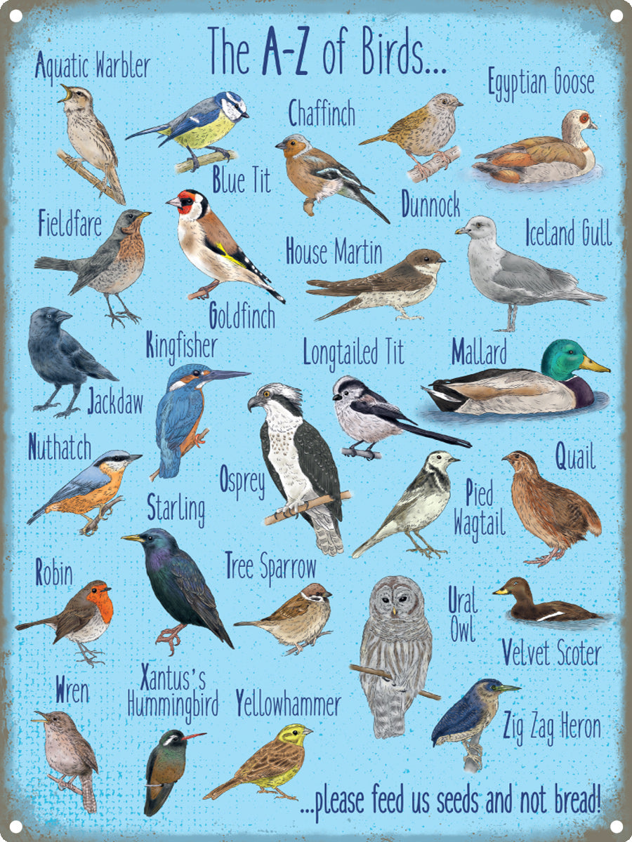 We at PopArtUK believe it's very important to know about the area in which you live and the wildlife you could attract. What better way to get your children and grandchildren involved than with this attractive tin sign. Aptly titled the A-Z of birds, this sign displays 26 species of birds alongside charming illustrations. In the right hand corner there is also a very important message to youngsters, stating 'Please feed us seeds, not bread.'
