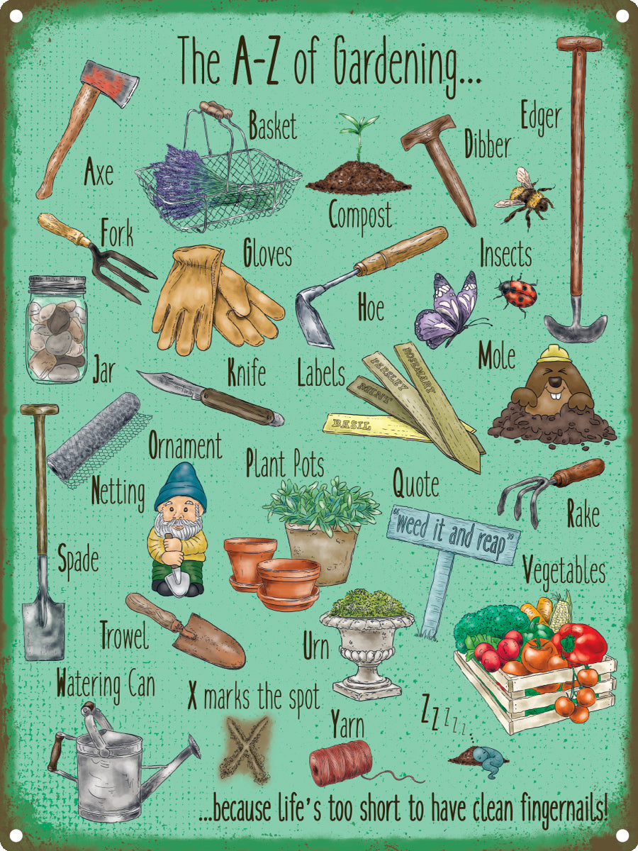 Featuring an item for every letter of the alphabet, this tin sign includes a plethora of decorative and useful items required for keeping a beautiful garden, such as an axe, a plant pot and a basket full of purple flowers. With the caption 'The A-Z Of Gardening...Because Life's Too Short To Have Clean Fingernails' this would make the perfect edition in any shed or summer house. Treat a friend or a loved one who may not be au fait with their garden with this wonderfully informative sign.