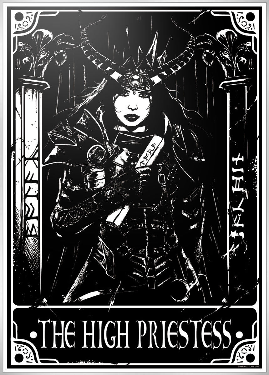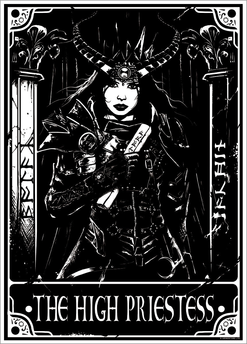 A figure of mystery, passivity and a sacred knowledge beyond the realms of this world, the High Priestess is a key card in any reading and a character you'll want on your side! Facing upright, this beautiful being symbolises intuition, divinity and clarity but turned upside down and it's another matter completely. Meaning withdrawal, silence and disconnection from yourself and others, it's time to face your fears head on, tapping on your inner power to guide you through any current struggle. Crowned with a horned diadem, in a suit of blackened armour this strikingly gothic presence from Deadly Tarot is the only symbol of power you need to decorate your walls.