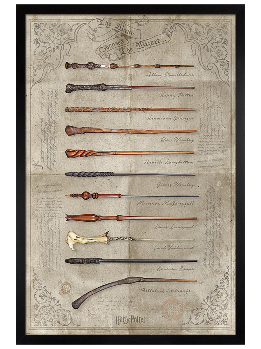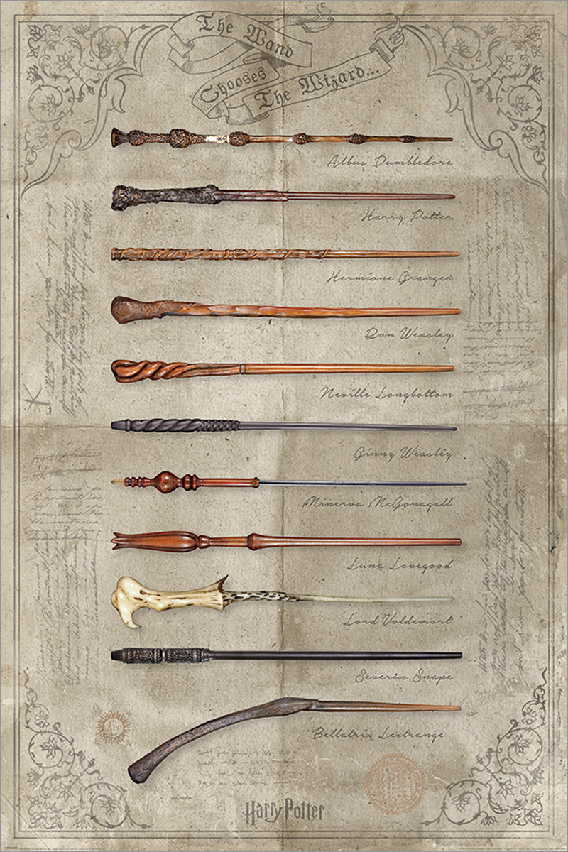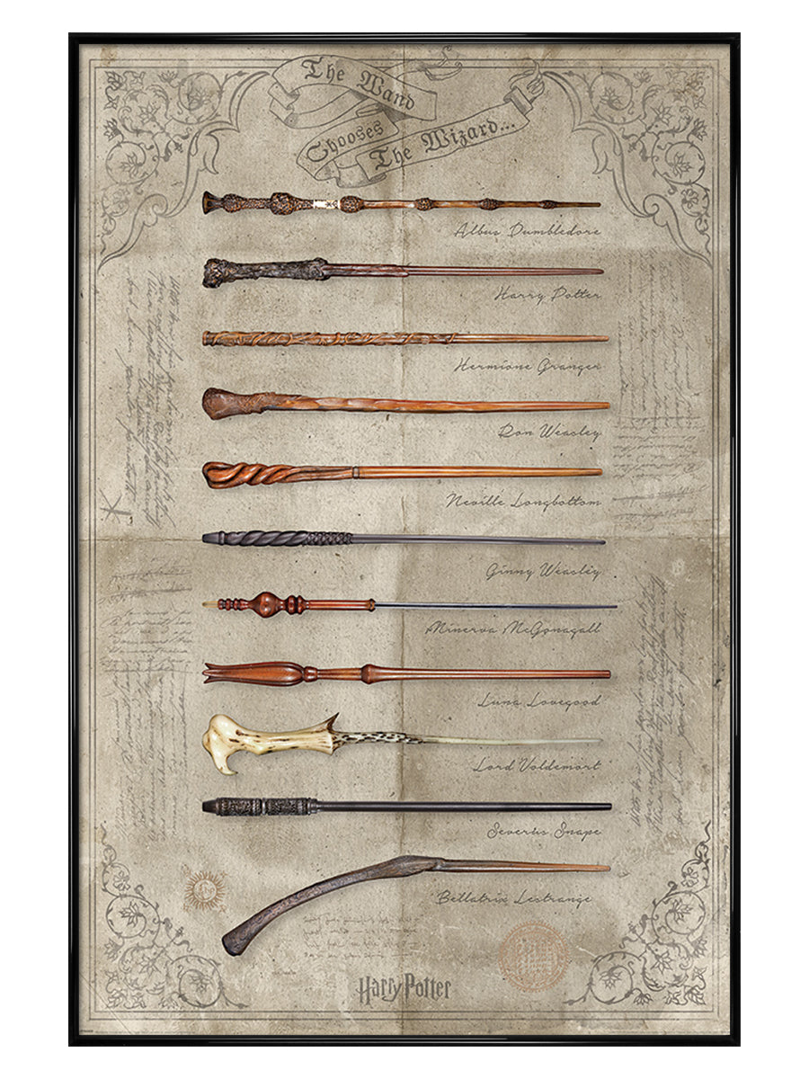 From the claw-like and menacing weapon belonging to the dark lord to Hermione's humble and modest design, this superb catalogue of Ollivander's finest creations is a must have for any true Harry Potter fan. Pictured atop an aged, paper background, learn the look of each witch and wizard's handcrafted wand, with this magnificent poster! 'The Wand Chooses The Wizard'!