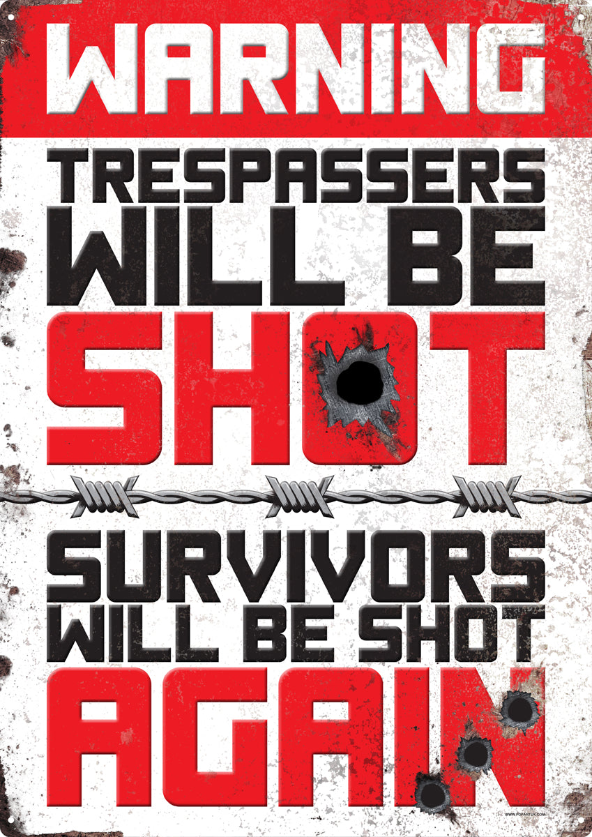 Funny Tin Sign: If you have a problem with unwelcome visitors then this humorous tin sign will serve as a warning to any undesirable callers. Declaring that trespassers will be shot and survivors will be shot again this retro distressed style sign is the perfect way to deter anyone from meddling with your property ever again.