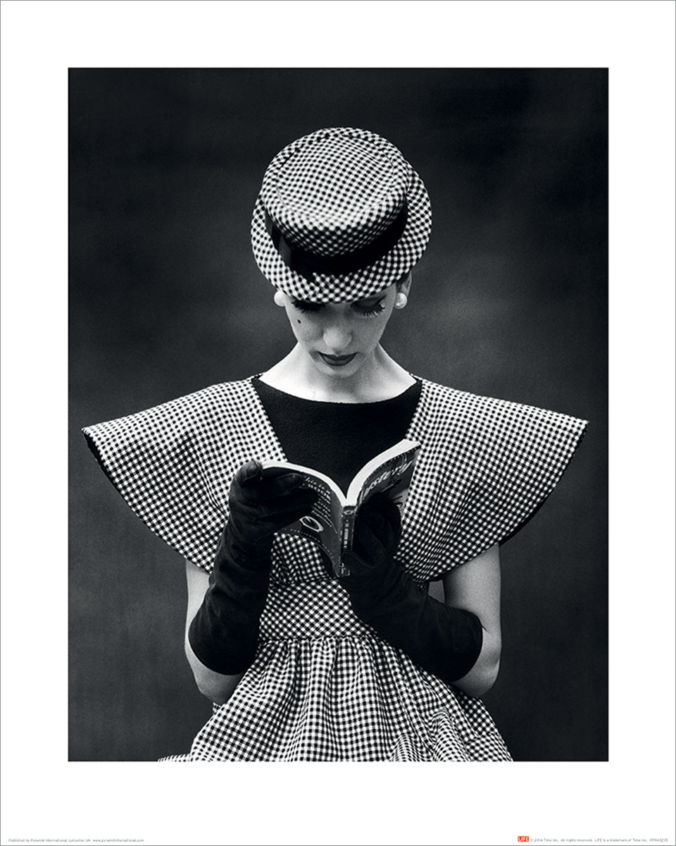 In her own world but standing out from the crowd, this red lipped woman dives into another realm as she waits, perched on a bench. Perfectly coordinated with her outrageously large shouldered dress and dotted hat, along with her long black gloves and statement makeup, this look shows the iconic push away from the restricted 50's fashion and into an exciting new age. Captured by Time Life magazine in 1959, this black and white print is a gorgeous snap shot in time, which will make a bold mark presented in your home.